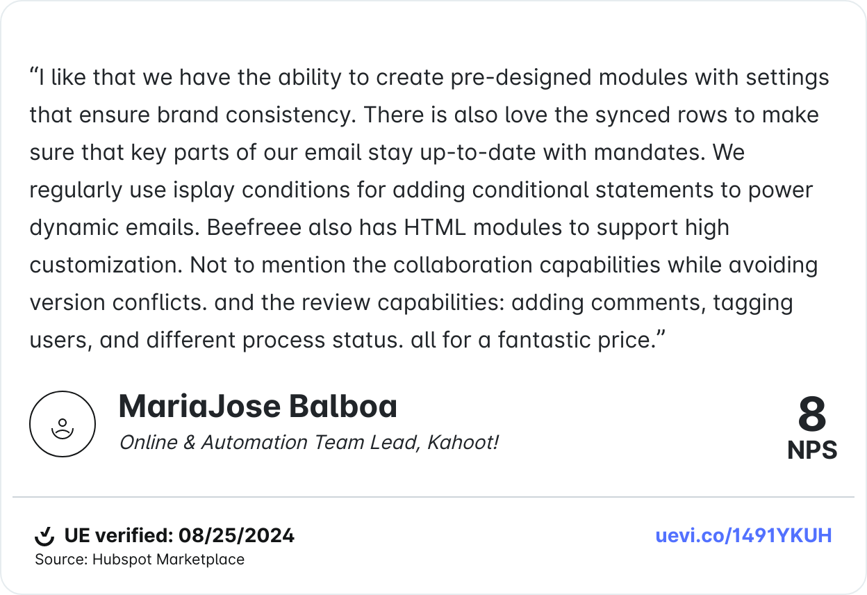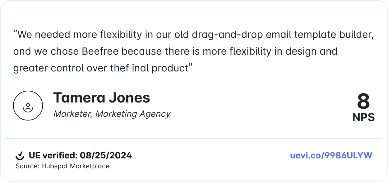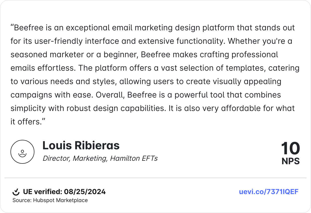 “With Beefree, we can create beautiful designs and quickly integrate them into our workflows. By connecting our HubSpot account to Beefree, we can easily transfer the email designs to HubSpot, making the entire process highly efficient and smooth.”