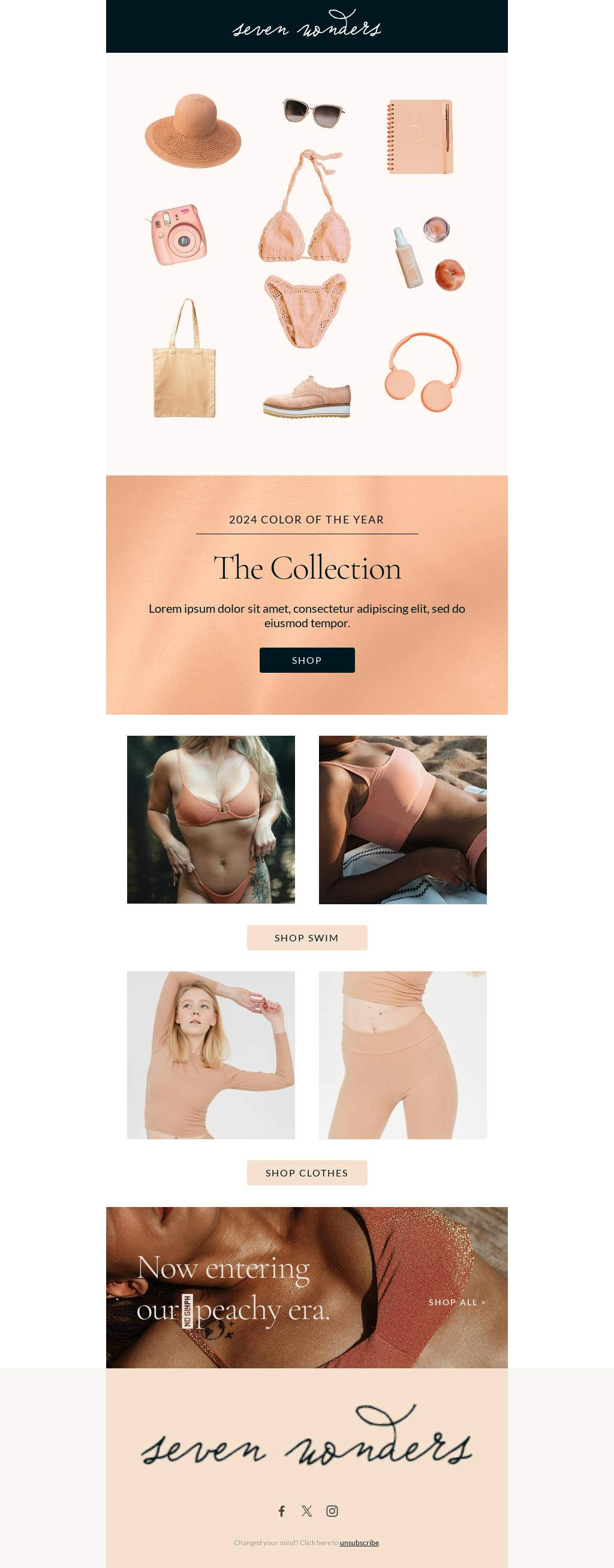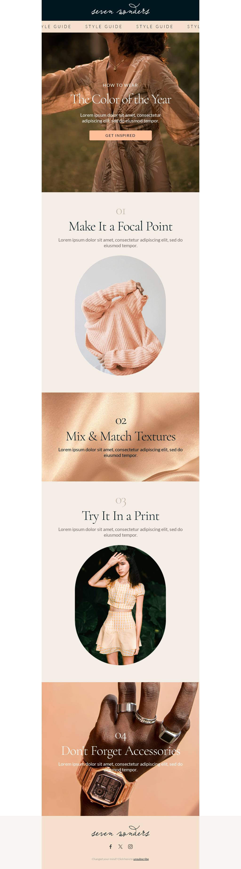 Stay ahead of the curve by sharing the latest industry trends and insights. It positions your brand as a knowledgeable player and provides value to your subscribers. The following template showcases the most recent Color of The Year as it relates to this fashion brand.