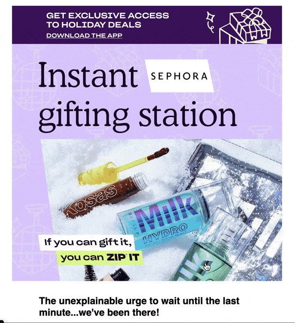 Sephora’s email campaign cleverly uses an animated GIF to promote their "Instant Gifting Station" with a focus on convenience for last-minute shoppers.