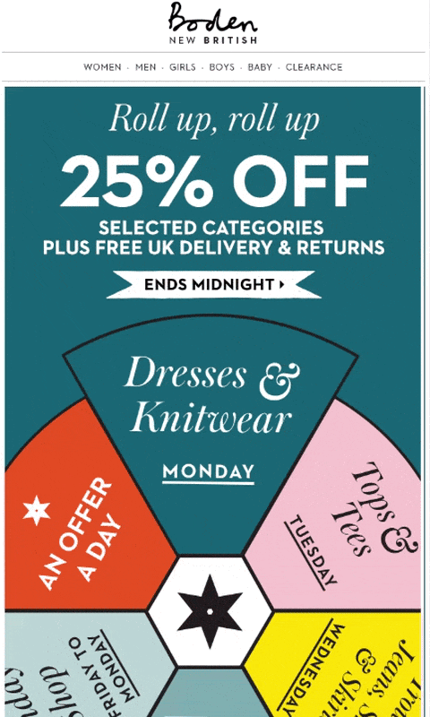 Boden’s email campaign uses a vibrant, animated wheel to highlight their daily deals, creating a sense of excitement and anticipation.