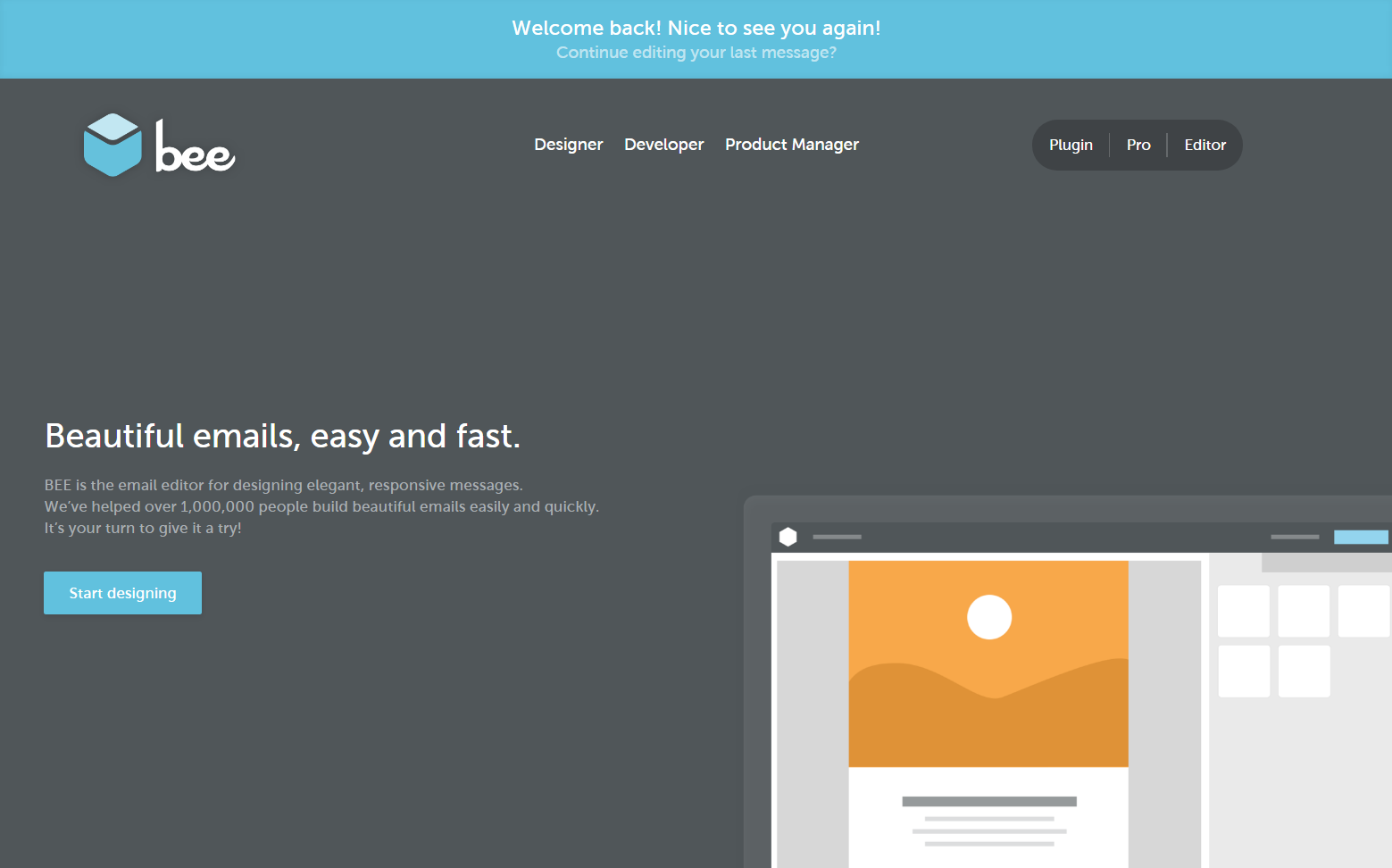 True today as it was on October 18, 2014, our core job-to-be-done is the same: providing users with an accessible design tool that frees them up to do their best work. Anyone can start designing with Beefree: no questions asked, no form to fill out, no email address to submit, nothing. No friction. All sorts of businesses use it to design all kinds of emails and landing pages.