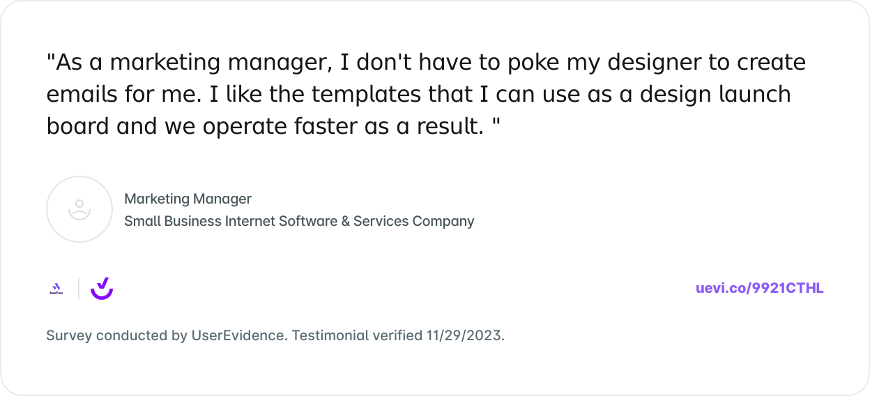 - Key features: Specializing in HTML email design, with an extensive catalog of email templates to use and a drag-and-drop email editor for complete customization‍