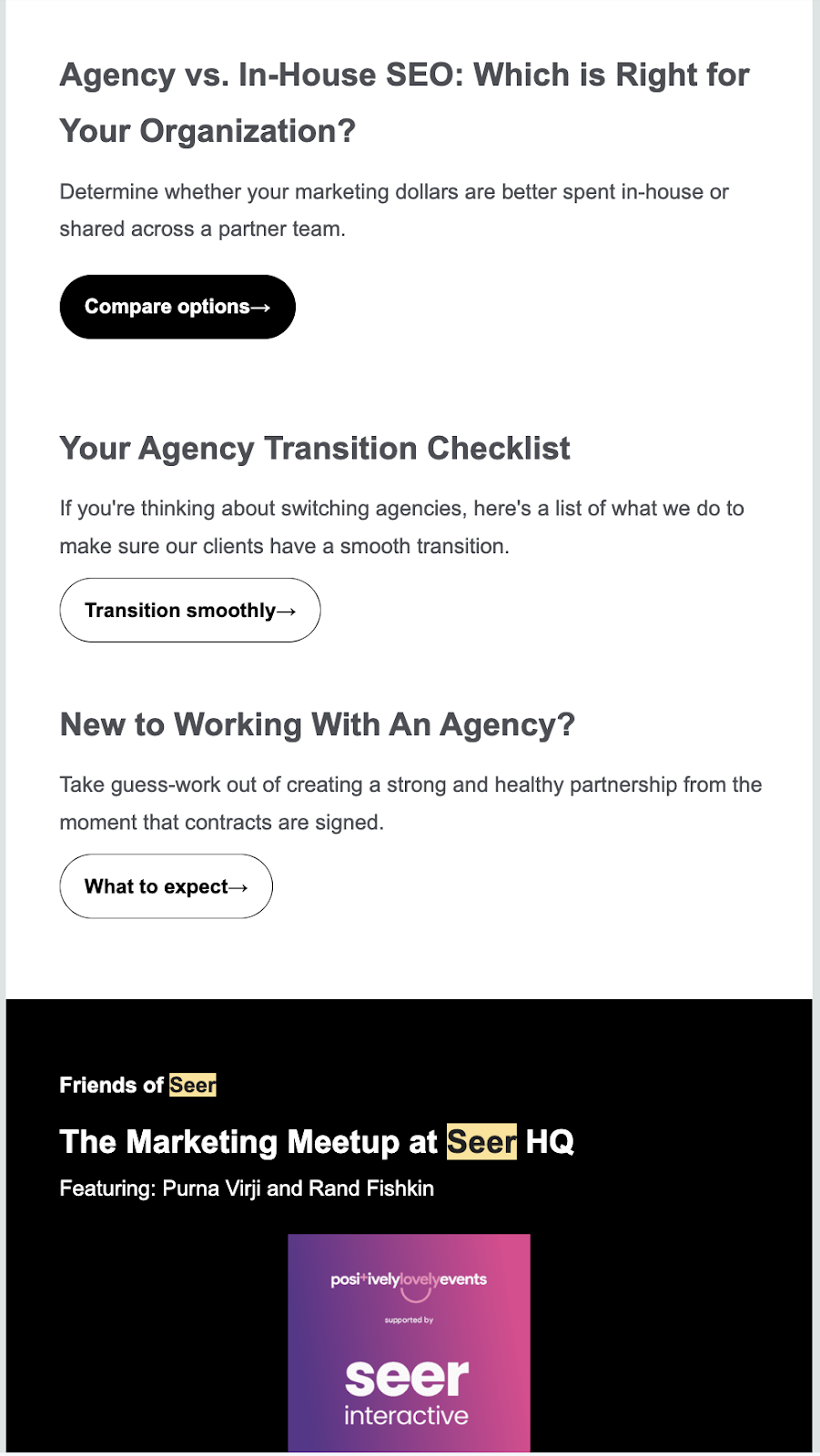 The second email targets potential clients who are likely in the discovery phase of what an agency does. Seer provides some insights to help the reader make more informed decisions with comparisons, a checklist, and an article with what to expect. This email, while does not directly promote Seer's services, let's the reader know that this agency is here to help keeping them top of mind.