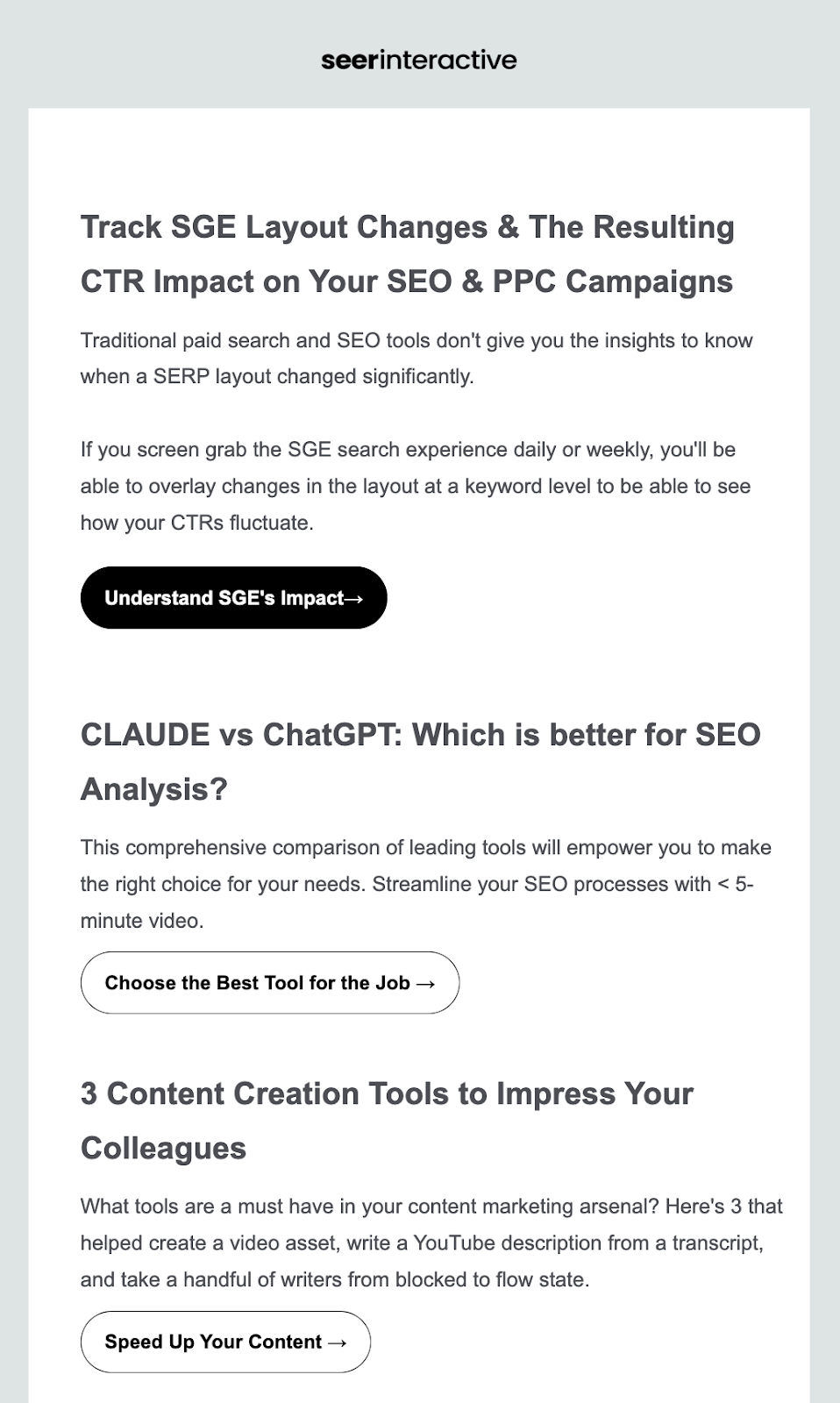 Seer Interactive, for instance, is a digital marketing agency serving a variety of audiences from digital marketers who need to stay up to date on best practices to prospective customers. You can see in the example below how Seer differs their emails based on the audience.