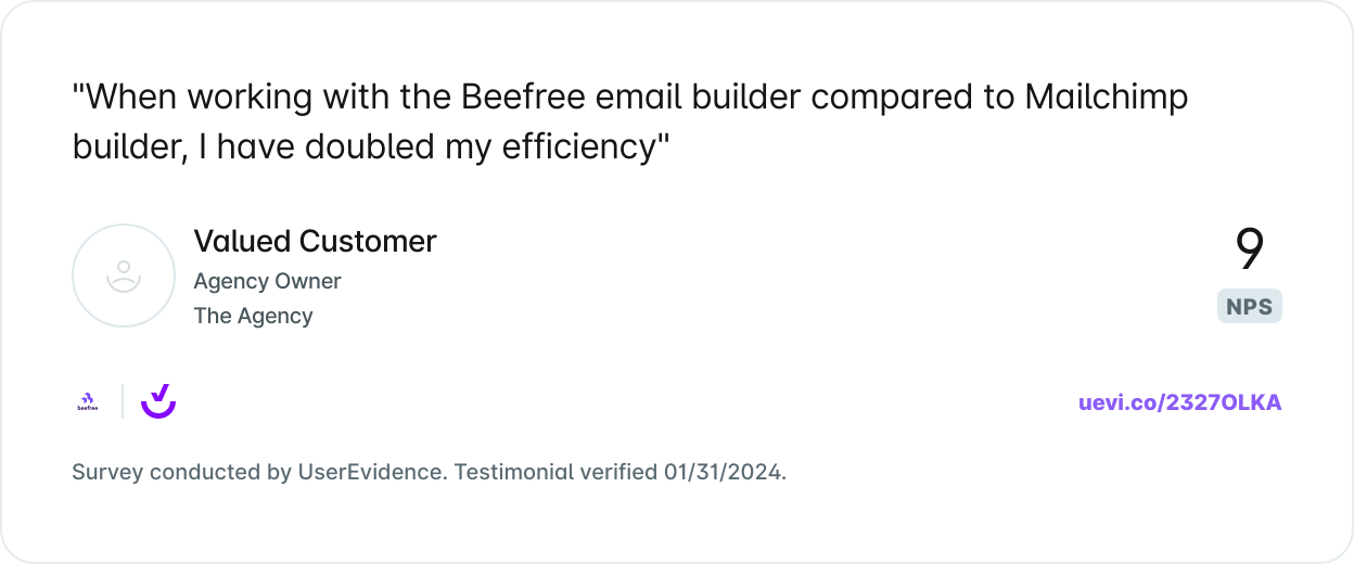 Want a more efficient way to create compelling marketing emails? The Beefree "Business" plan is the perfect solution for growing agencies to scale their email marketing processes and campaigns. Start your free 15-day Business trial today!Â