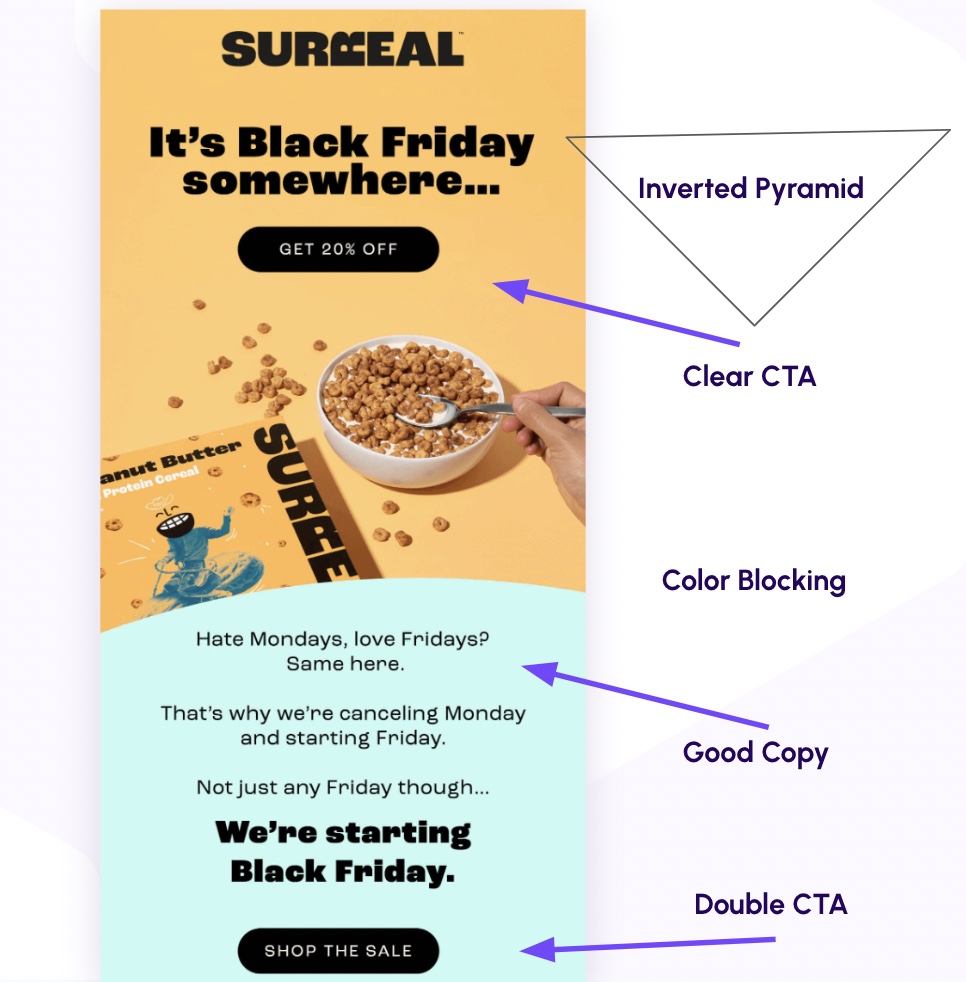 In the clutter of the BFCM inbox, creating emails that capture attention is crucial. Nelson shared effective design techniques, such as utilizing an inverted pyramid structure that naturally guides the reader’s eye to the call-to-action (CTA). Additionally, integrating countdown timers can enhance urgency and anticipation among shoppers, reinforcing the limited-time nature of your offers.