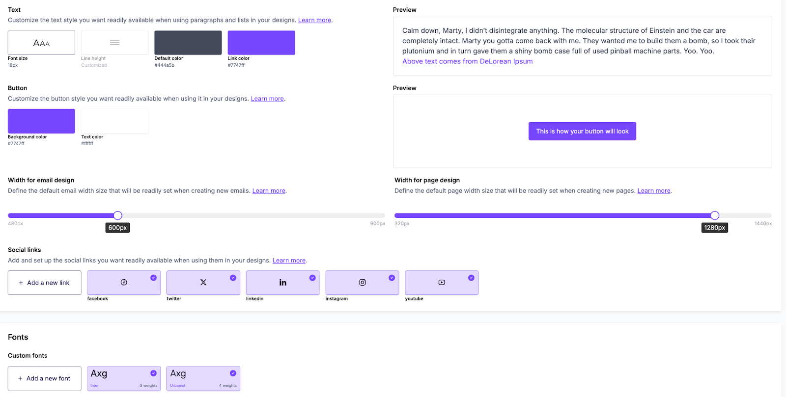 Once you import your brand’s essentials, you can continue to add brand elements. You can get as granular as you’d like. From a predefined width for emails and pages, to the appearance of your CTAs.