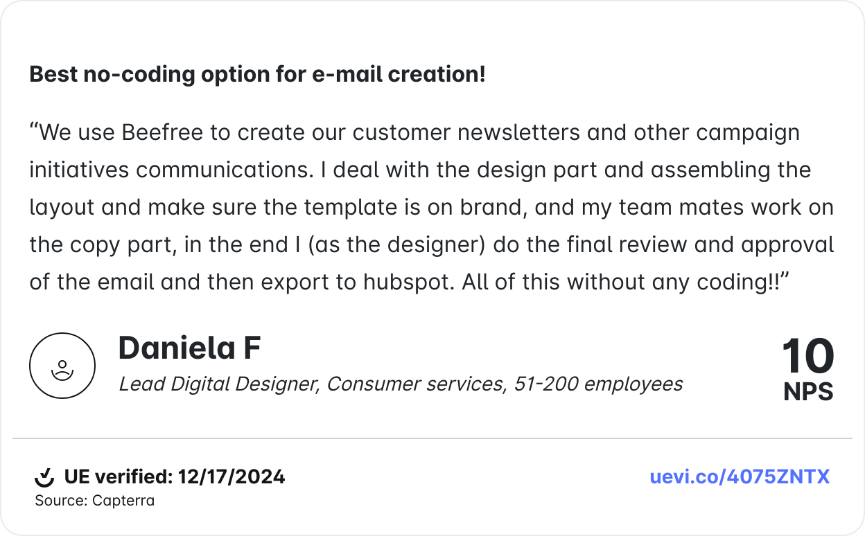 Beefree makes balancing creativity with your brand guidelines seamless. Its combination of brand management, productivity solutions, and a no-code drag-and-drop editor enables everyone to create beautiful designs that inspire people to action and drive results.