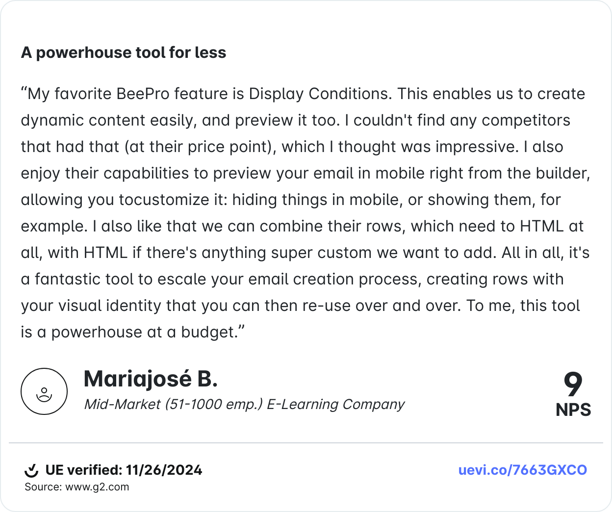 With Beefree, you can turn your designs into playgrounds. Easily add videos, GIFs, countdown timers, surveys, hover effects, and more. To see what’s possible, we recommend browsing through our template catalog!
