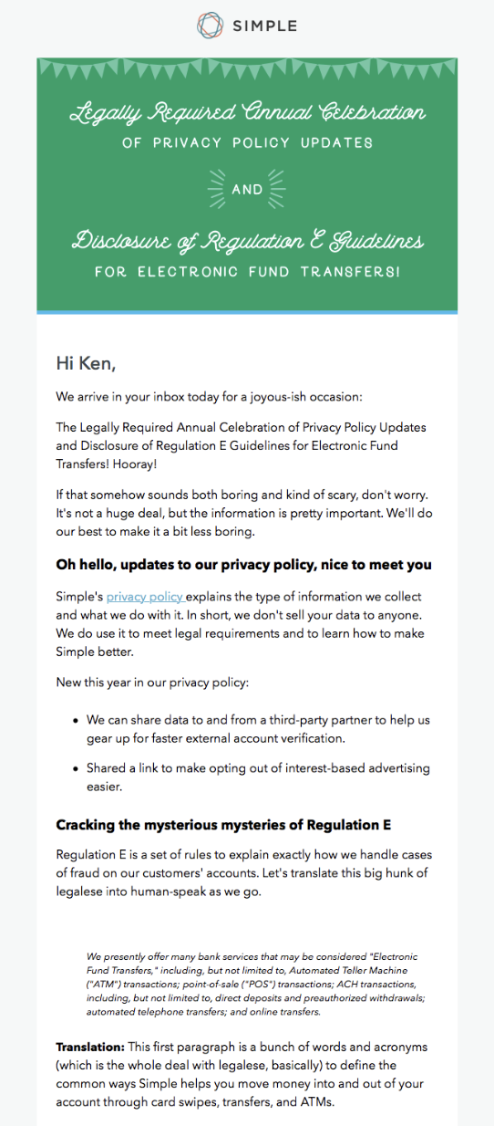 Portland-based bank Simple uses a similar strategy in their privacy emails: