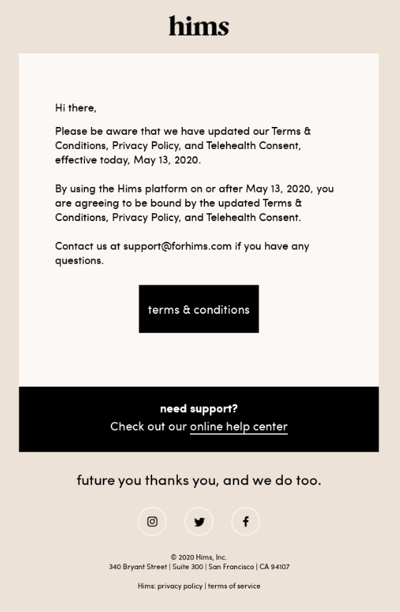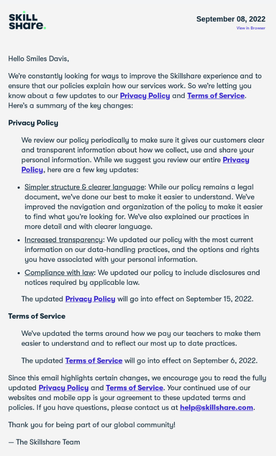 The email is clear and straightforward but the most effective thing they do is break out what the updates are, just as importantly, why they’ve made them. They also include several links to the privacy policy and terms of service so they’re easy to find, and they offer a way for recipients to contact them with any questions or concerns.