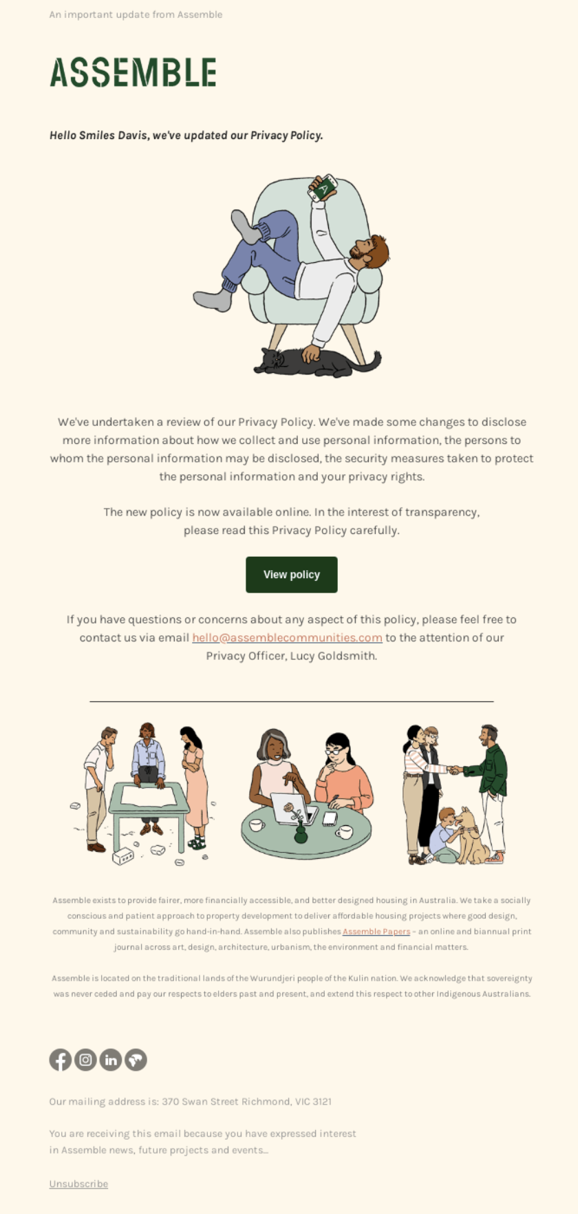 Plus, it’s a subtle reminder that you care about keeping things polished and interesting, even when the topic is not. The email below from Assemble is a perfect example of how even a privacy policy email can be a tool to reinforce trust, strengthen customer connection, and establish brand recognition.