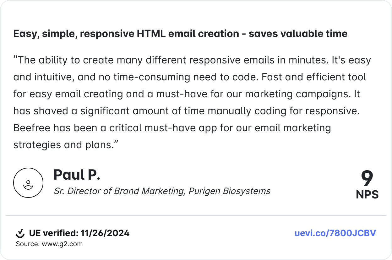 Speed is key, especially if you’re running time-sensitive campaigns. Beefree simplifies the design process with reusable content blocks, real-time collaboration tools, and the ability to transform emails into landing pages with a single click. These features enable you to produce high-quality materials in less time, allowing you to focus on strategy and content rather than struggling with technicalities.