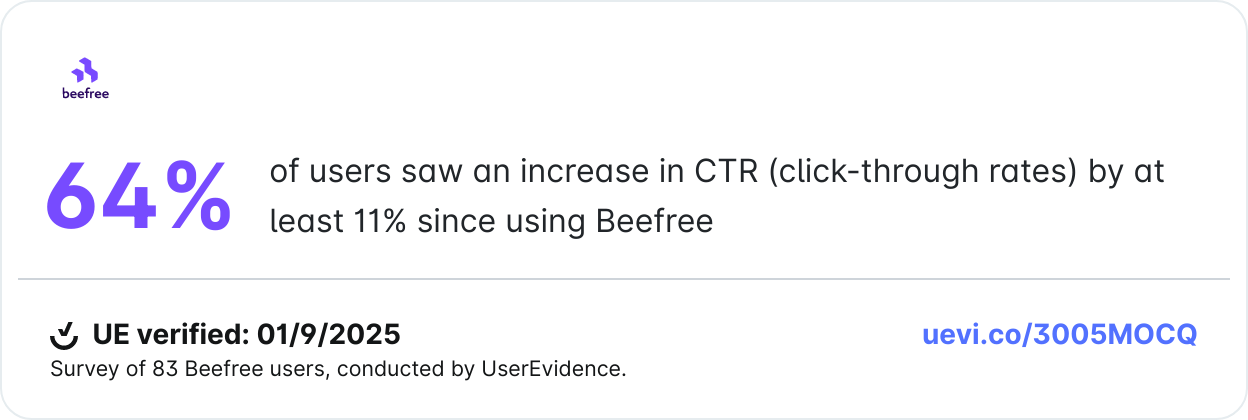 A significant 64% of Beefree users report an 11% or more increase in click-through rates after using the platform. By enhancing the visual appeal and personalization of your emails, Beefree helps you achieve better engagement with your audience. The ability to test and iterate your designs ensures continuous improvement in performance.