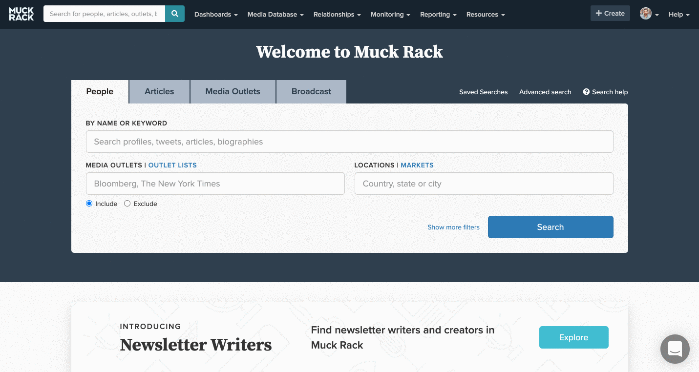 You can use tools like Prowly or Muck Rack’s media database, shown below, to easily find journalists who cover topics that align with your story.