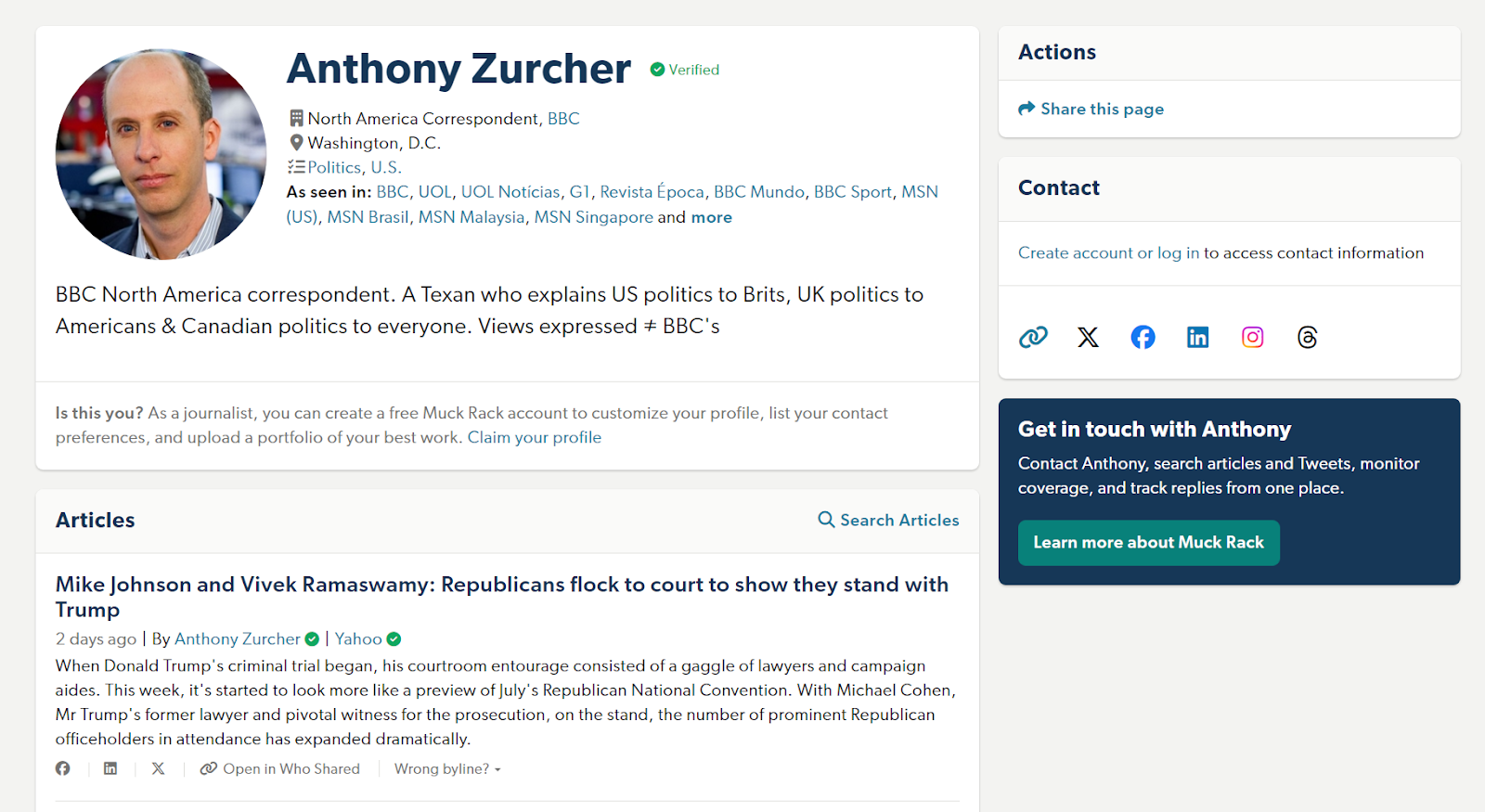Once you have your list of journalists in your niche, dig deep into their recent articles and general topics of interest. Again, a tool like Muck Rack can help you easily find their most recent articles or beats since each journalist has a profile on the platform.