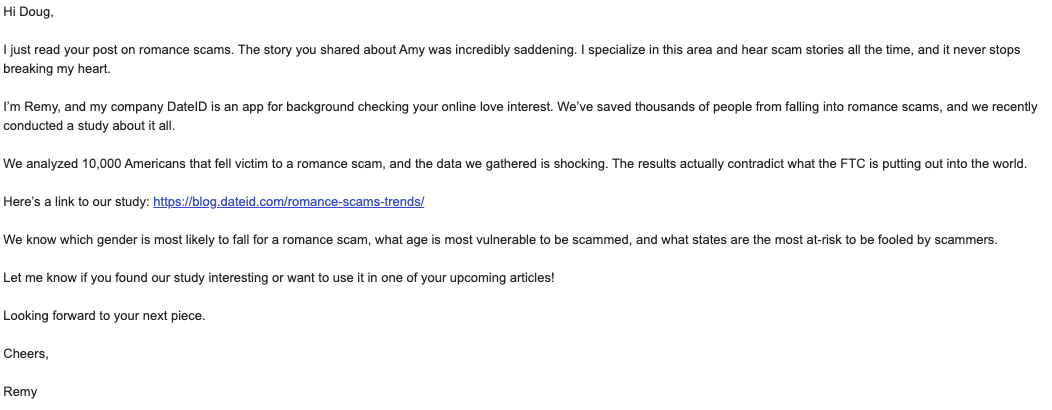The writer, Remy, also personalizes by referencing the journalist’s recent post on romance scams and by mentioning his first name. Remy also signs off courteously with a brief “Cheers” and her name.