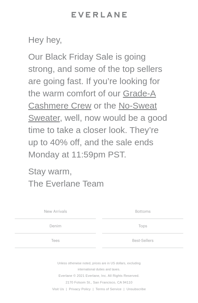 - Intentional design: As a brand built on sustainability, the minimal design of this last-chance email for Black Friday, a holiday built on consumerism, is intentional. The minimal design serves to give the feeling of a "gentle reminder," without pushing too much on hyper-consumerism.