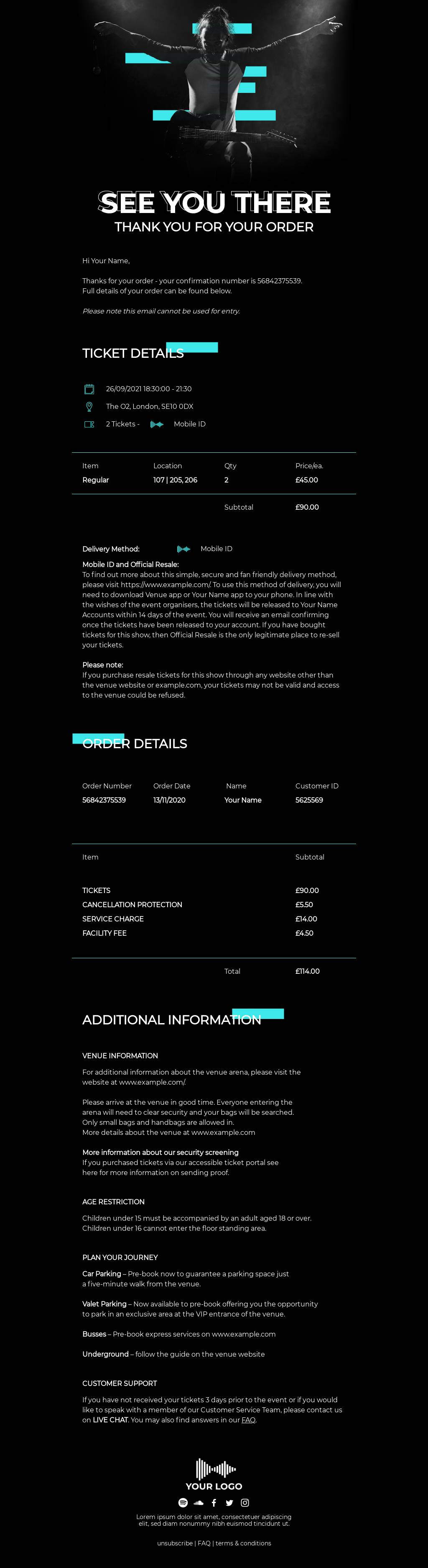 Letting customers know you received their order gives them peace of mind, knowing their purchase was successful. It also gives them essential details like a recap of their order, the order number, and the receipt.