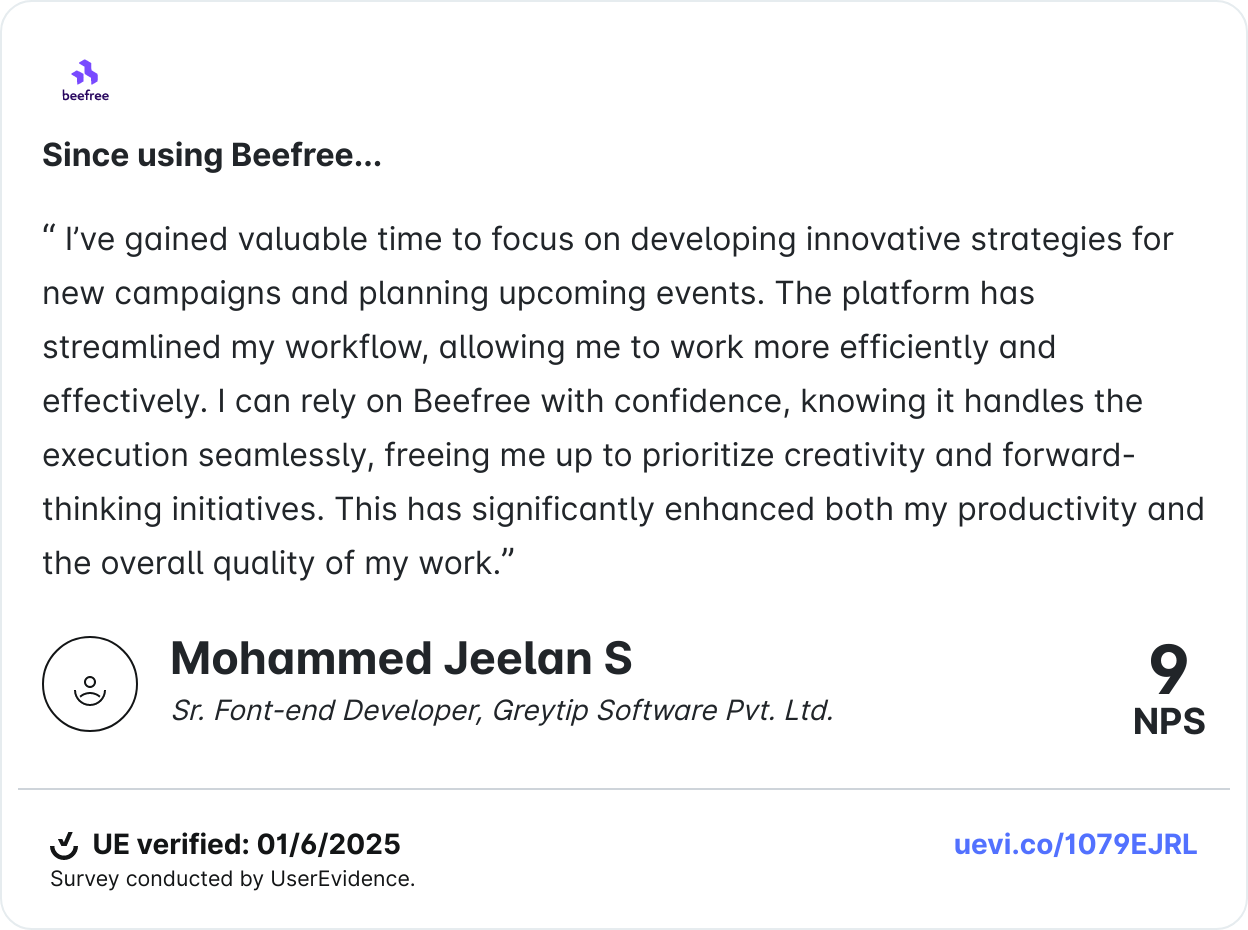 By cutting down on the nitty-gritty of email production, like formatting, coding, and repetitive edits, Beefree gave you the freedom to focus on what truly matters: design.