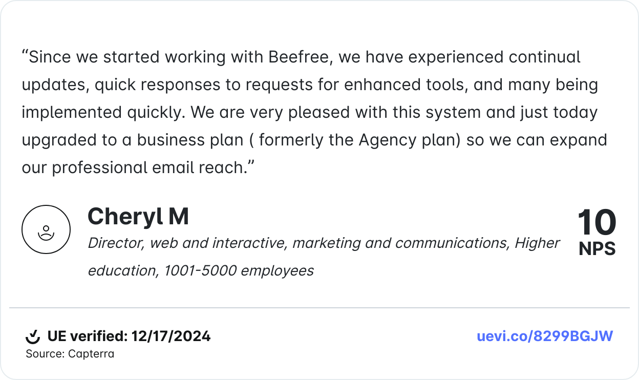 In a digital landscape where first impressions are everything, beautiful design isn’t just nice to have—it’s a necessity. And with Beefree, creating visually appealing emails has never been easier, empowering you to continue delivering designs that captivate and convert.