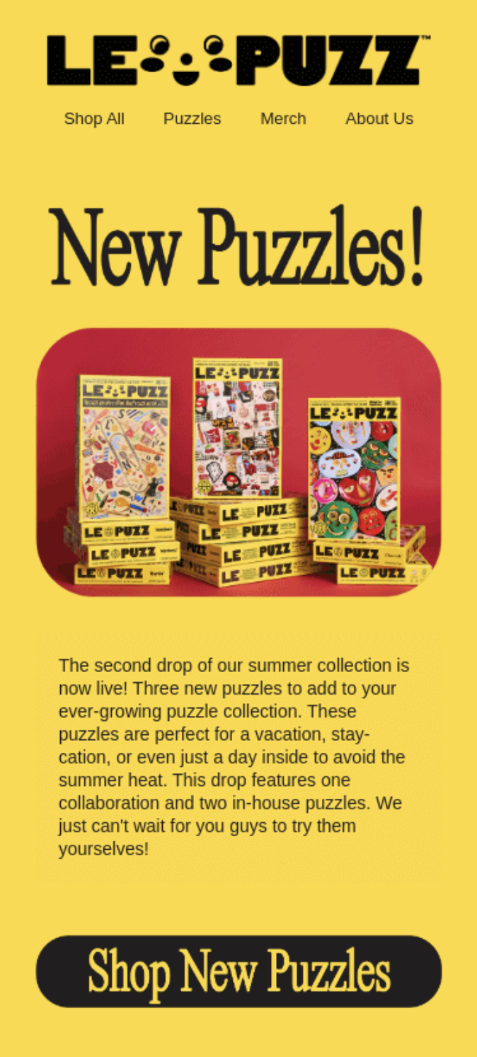 The following example from Le Puzz shows these principles in practice. It uses a single vertical layout with big buttons and good hierarchy to guide the reader to the end of the email. So, even if your readers skim the email, they understand its purpose.Â