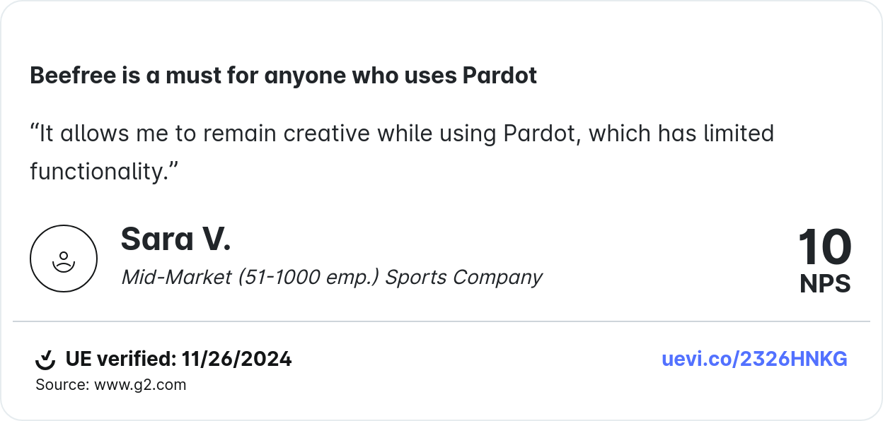 From higher ed to healthcare, SaaS to nonprofits—teams across industries are making the switch to Beefree not to replace Pardot, but to complete it. With Beefree you can: